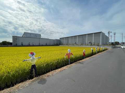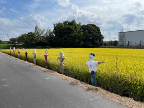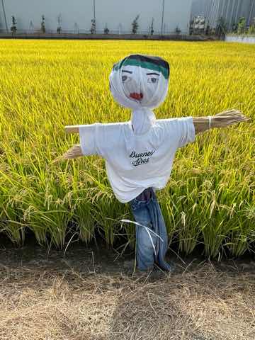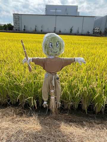 5年生が作ったかかしが田んぼを守っています。もうすぐ稲刈りの予定です。立派に実った稲穂をよろしくお願いします。