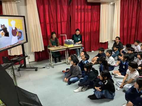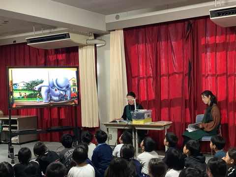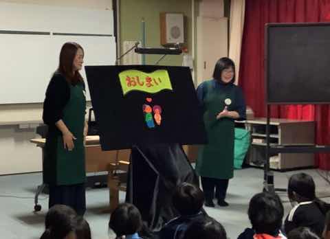 ブックさんによるお話玉手箱が行われました。ブラックパネルシアターや読み聞かせがあり、子どもたちは自然と本の世界に引き込まれていきました。みんなで体を動かす場面もあり楽しい時間になりました。