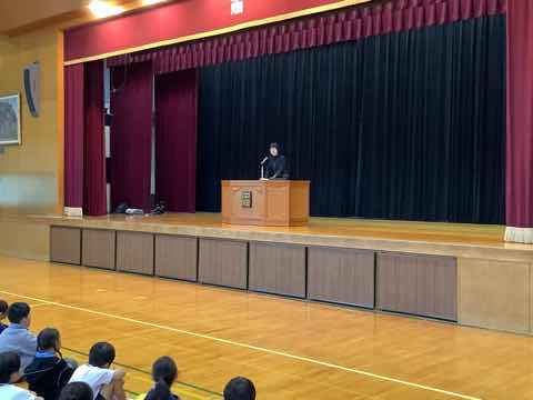 11月の全校朝会を行いました。校長先生からは、学習発表会でのがんばり、「どうせ…」とあきらめないで、自分から積極的に取り組んでみようというお話でした。そのあと表彰伝達を行い、全校で合唱の練習をしました。