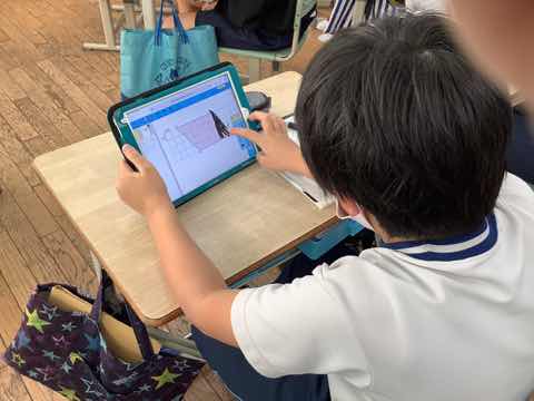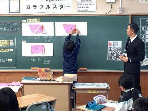 5年生の算数「面積」の研究授業が行われました。平行四辺形の面積を、切ったり、回したり、移動したりと考えながら面積を求めることができました。