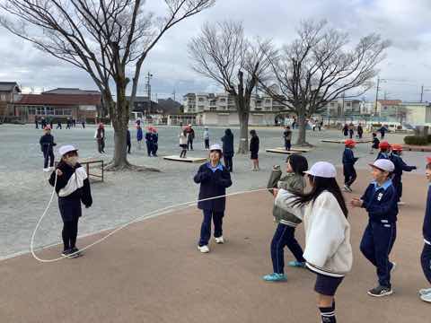 ペア学年で大縄跳びにチャレンジしています。昇降口にその結果を掲示しています。放課になると個人種目にチャレンジしたり、ペア学年や学級で大縄で楽しく活動しています。