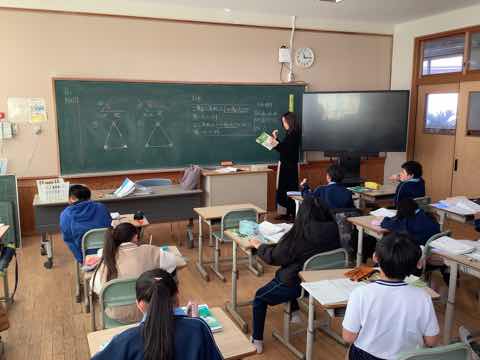 3年生の算数の授業です。三角形の角度の学習をしています。3クラスに分かれて取り組んでいます。