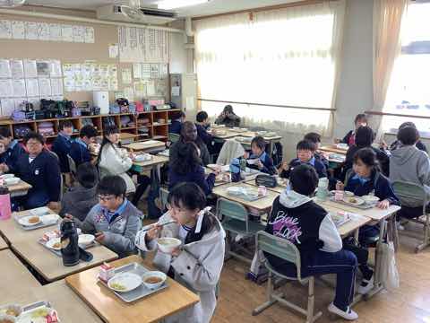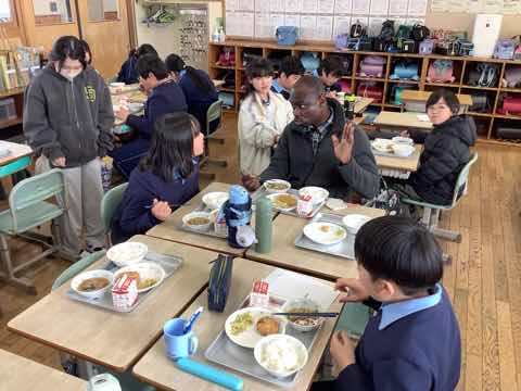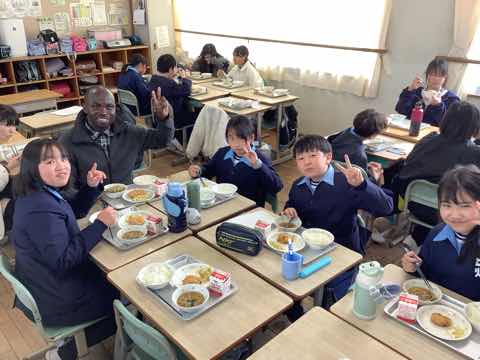 本校のALTであるアジュマン先生は給食の時間も子どもたちと一緒に過ごしています。今日の給食は6年生と楽しく食べています。