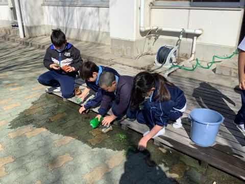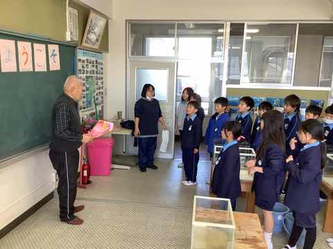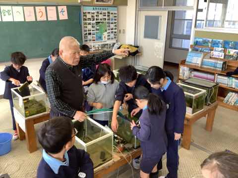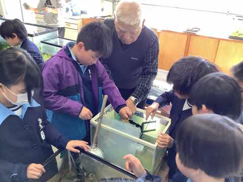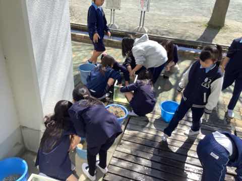 矢作川教室で育てていた魚たちを絆池に入れます。そのために神本先生と一緒に生き物を移動し、水槽をきれいに掃除しました。終わった後は神本先生に1年間のお礼とお花をプレゼントしました。