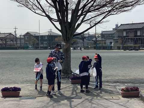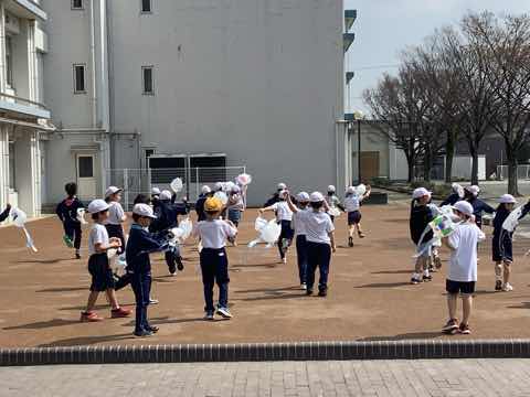 あたたかい春の日に、2年生の子どもたちは外で元気よく凧遊びをしました。