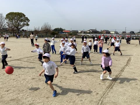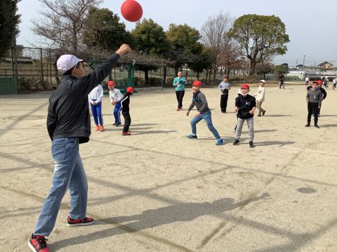 ペア学年が、「ケイドロ」のように当てられた下級生を助けて「復活することができる」というルールのドッジボールで楽しみました。