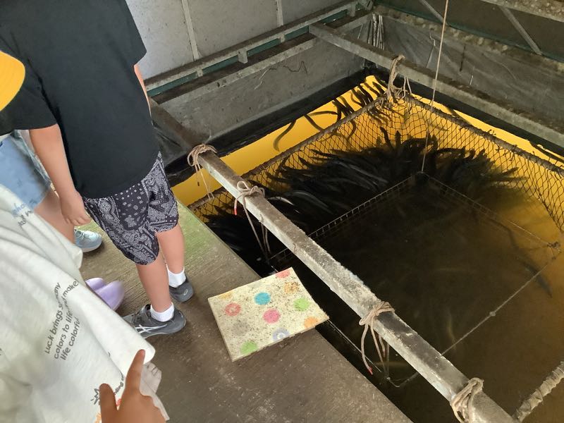 まずは、うなぎのビニールハウスの見学です。中はとても暑く、サウナのようでした。思ったよりもたくさんのうなぎがいて、みんな驚いていました。