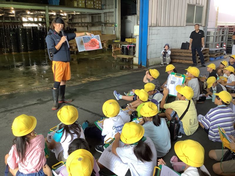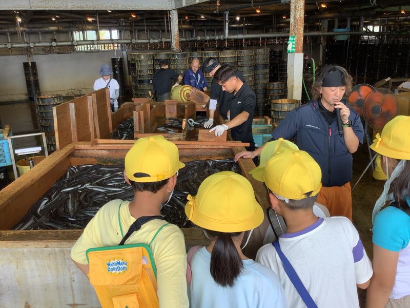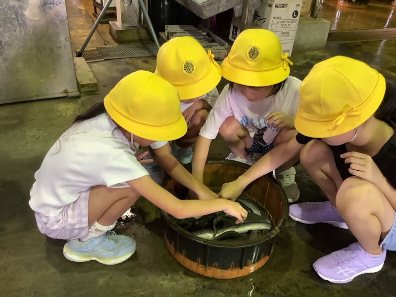 次に、実際にうなぎを選別しているところに行きました。直接うなぎを触らせてもらったり、蒲焼きを作っている様子を見せてもらいました。「ヌメヌメしてる!」「蒲焼き食べてみたい!」と興味津々でした。