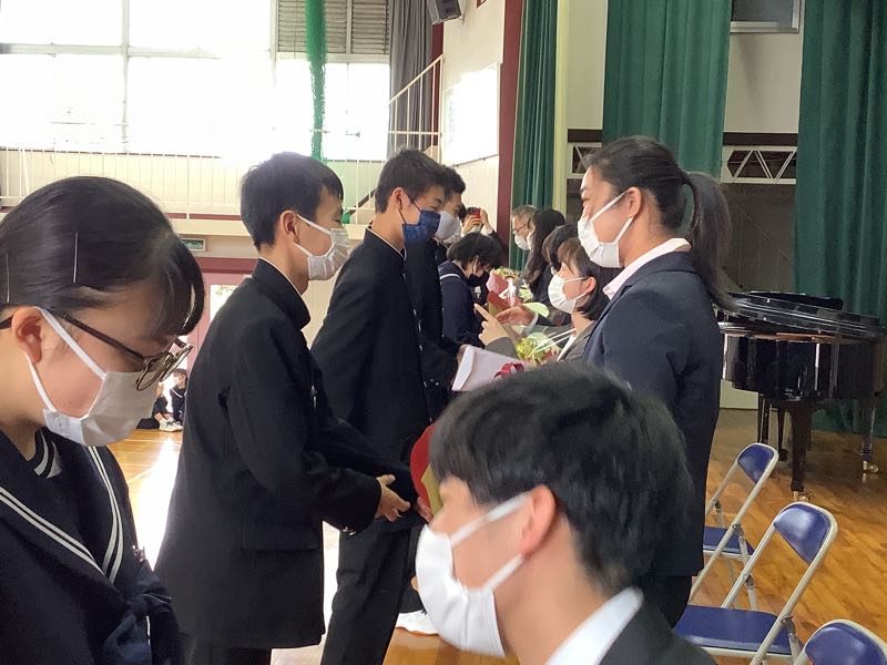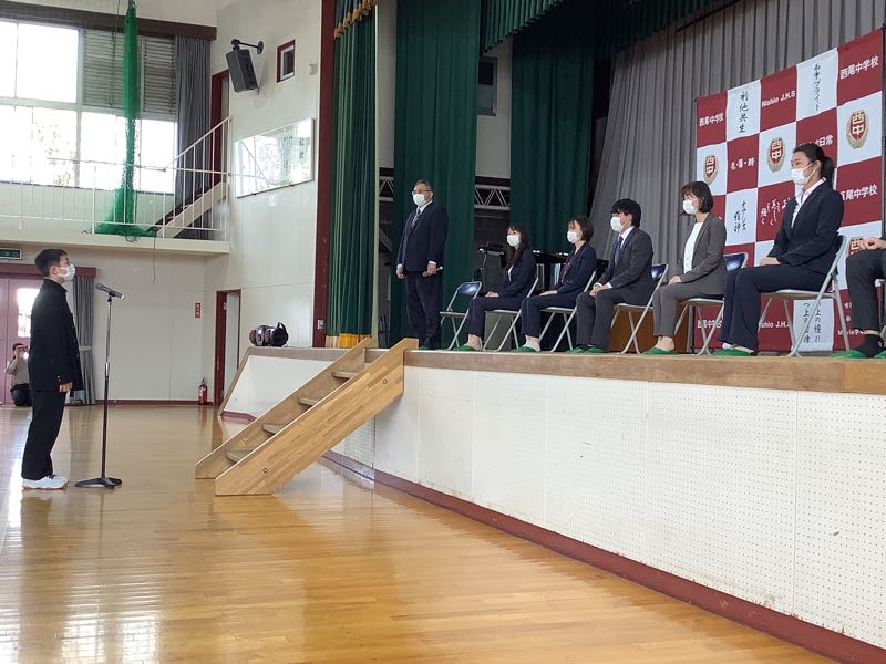 その後、生徒会役員、委員長から新1年生に向けて、学校生活や各委員会活動についての説明を行いました。最高学年として堂々と話す姿に、新1年生も真剣なまなざしで話を聞いていました。