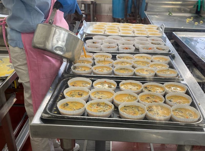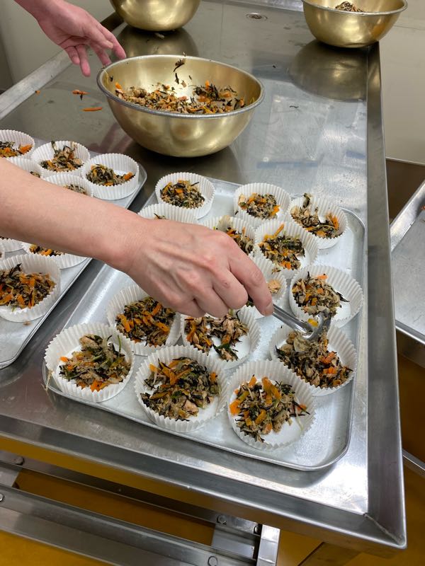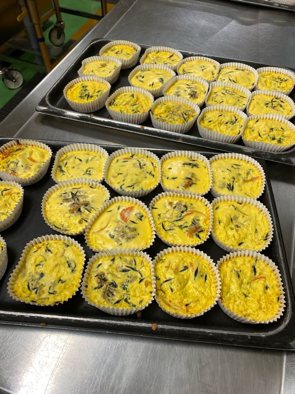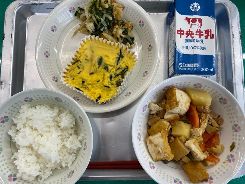 今日の献立ごはん、牛乳、五目卵焼き、アーモンドあえ、野菜と生揚げのうま煮五目卵焼きは手作りです。家庭で作るような卵焼きを作ることはできないので、カップに具を入れ、卵を流し込み、蒸し焼きにします。今日の具はひじきやツナ、にんじん、たまねぎ、三つ葉を入れました。どんな具でも合うので、ご家庭でも普段とは少し違う卵焼きをよかったら作ってみて下さい。