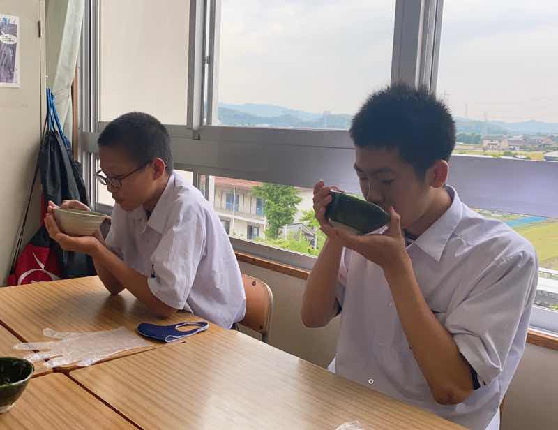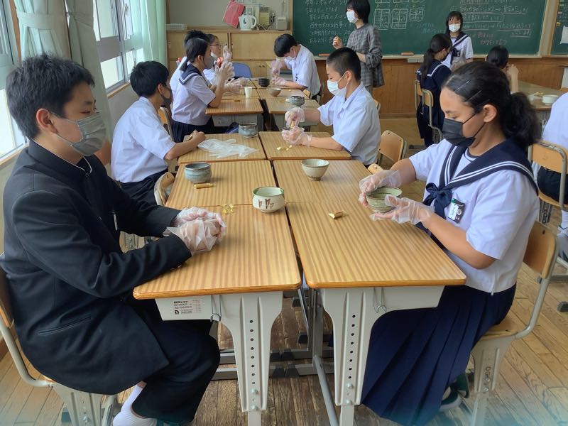 3年生は、1年生の時に美術の時間で作ったマイ茶碗を使いました。