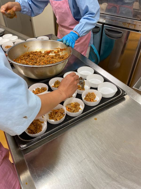 今日の献立えびピラフ、牛乳、ラザニア、春キャベツの豆乳スープ今週は4日間お弁当だったので、久しぶりの給食でした。お弁当ありがとうございました。今日の給食は、手作りラザニアです。ミートソースを作り、カップに具、餃子の皮、具、チーズを順番にのせて焼きました。ご家庭で作る時は、餃子の皮と具を何層か重ねるとよりおいしく仕上がります。