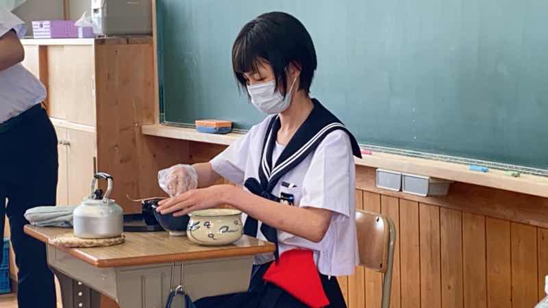 西尾茶実行委員の生徒たちが中心となって、お茶の点て方を教えてくれました。