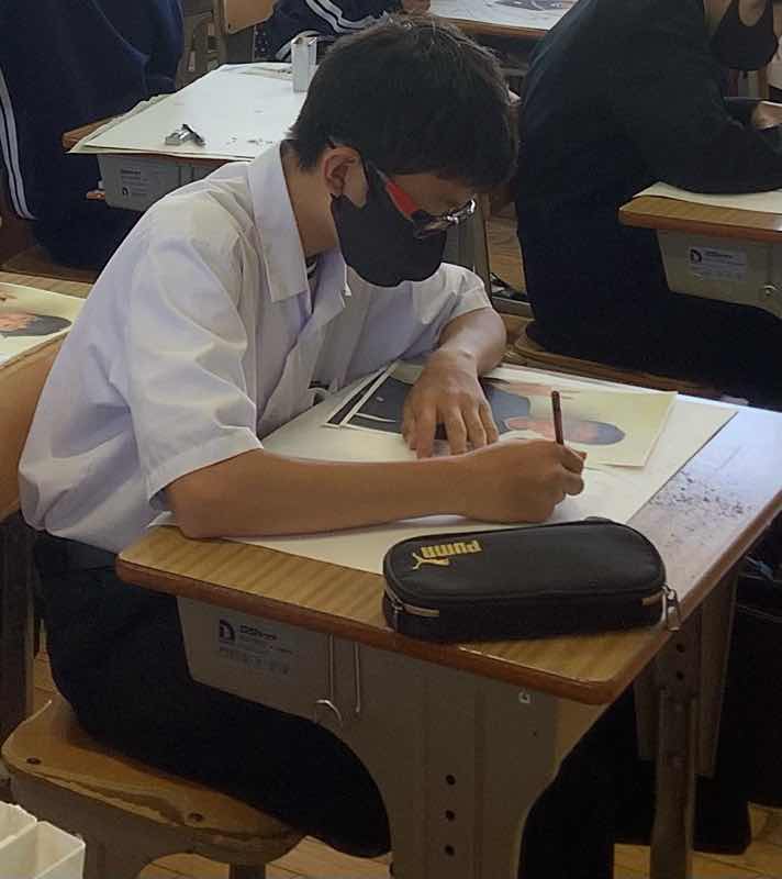 本日、全校で絵をかく会を開催しました。各学年ごとに題材が決められており、1年生は身近なものをテーマに静物画、2年生は自画像、3年生は空想画を描きました。