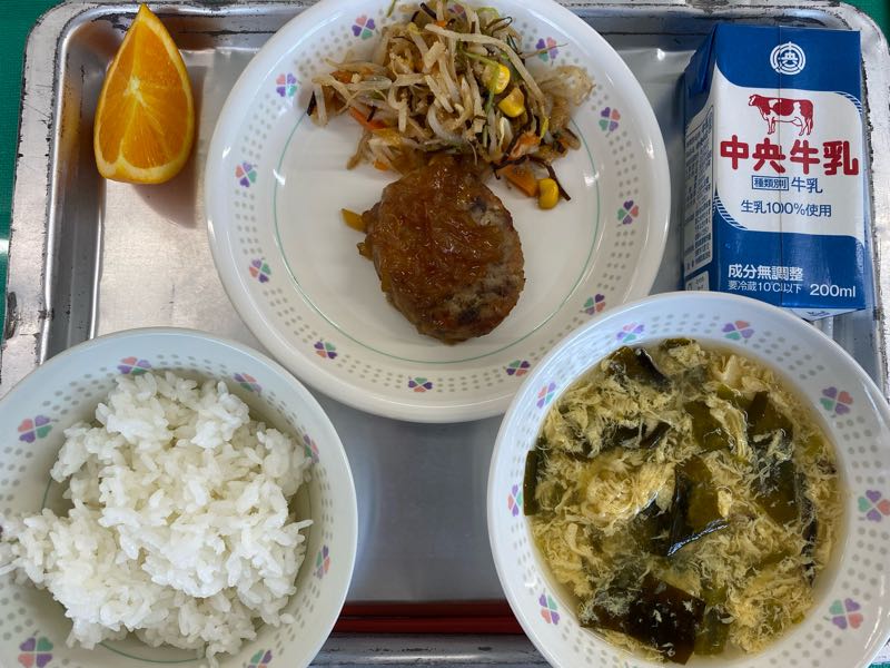 今日の献立ご飯、牛乳、知多牛ハンバーグの玉ねぎソース、もやしとコーンのおひたし、かきたま汁、オレンジ知多牛ハンバーグは、「みんなが笑顔になれる給食」を目ざした西尾市の取り組みの学校給食スペシャルメニューです。献立を見た時、楽しみにしている生徒や先生方が多かったです。おいしくいただきました。