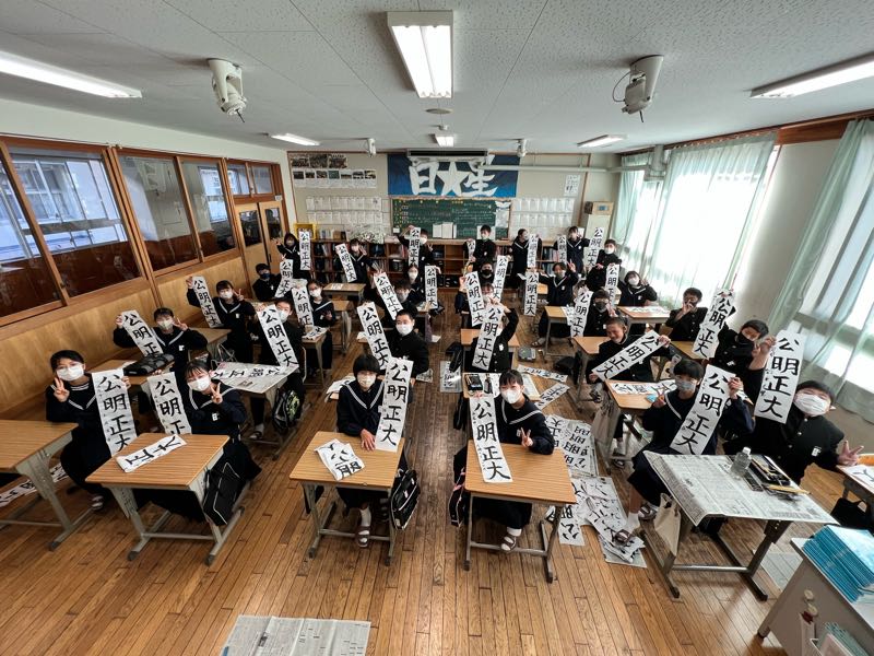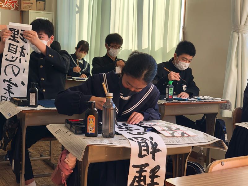 書道を通して自己を表現する競書会。1年生は「公明正大」、2年生は「笑門来福」、3年生は「理想の実現」を書きました。丁寧にじっくりと書き上げました。
