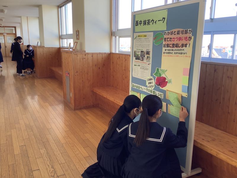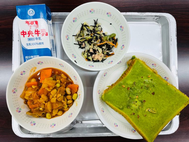 今日の献立抹茶トースト、牛乳、チキンビーンズ、ひじきとツナのサラダ西中抹茶ウィークの最後は、リクエスト給食の上位にランキングした抹茶トーストです。レシピを持ち帰る生徒も多かったです。 3年生は卒業前の最後の抹茶トーストということで、味わって食べていました。