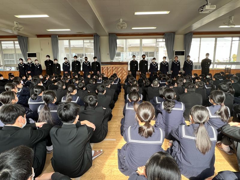 あいさつ、返事、代表生徒の語りなど、迫力があり圧倒されました。ピリッと締まった良い会になりました。