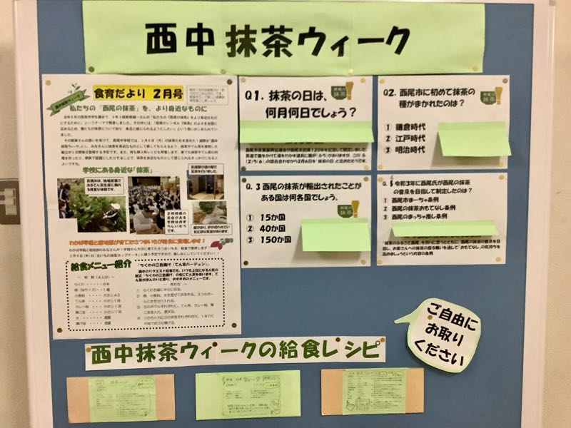 西中生徒が西尾市学生議会で発表した「僕たちの『西尾の抹茶』をより身近なものにするために」という提案をうけて、今日から2月10日まで「西中抹茶ウィーク」を実施します。抹茶やてん茶が使われた献立が給食に登場します。