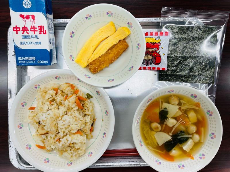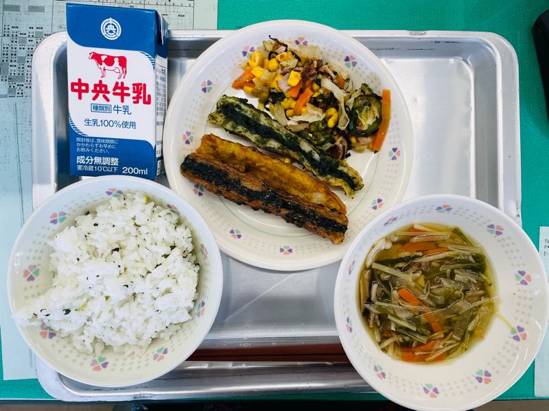今日の献立てん茶菜飯、牛乳、ちくわの三色揚げ、元気サラダ、沢煮椀西中抹茶ウィークの1日目は、てん茶菜飯が登場しました。今日のてん茶は、西尾茶協同組合様が寄付してくださいました!