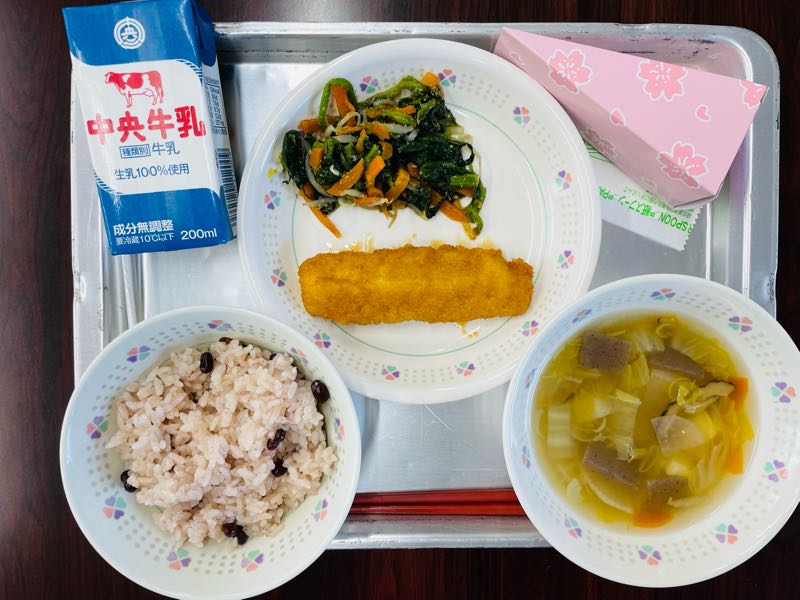 献立赤飯、牛乳、いかフライのレモン煮、ほうれん草のごまあえ、八杯汁、卒業お祝いデザート3年生が給食を食べるのも、今日を入れてあと3回です。お祝いには欠かせない「赤飯」、人気の「いかフライ」、スペシャルメニューの「桜のケーキ」で、お祝いの雰囲気が高まりました。