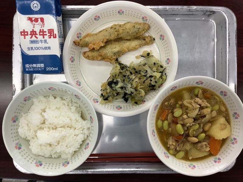献立ご飯、牛乳、ししゃもフリッター、キャベツの磯香あえ、カレー肉じゃが今週は「歯と口の健康週間」です。それにちなんで給食でも、虫歯予防を意識してよく噛む献立や、歯を丈夫にするカルシウムやその吸収を助けるビタミンDを含んだ食品をたくさん使用した献立を実施しています。今日は、カルシウムが豊富な「ししゃもフリッター」がありました。生徒たちはよく噛んで食べていました。