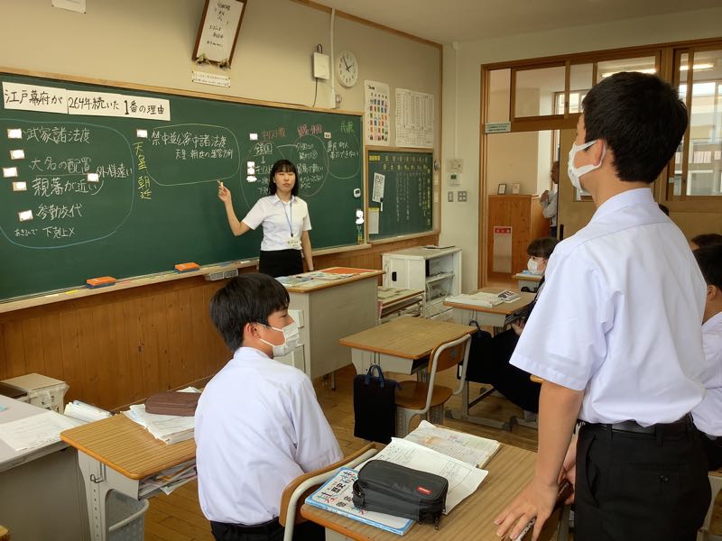 本日、教育実習生が研究授業を行いました。「江戸幕府が264年続いた一番の理由を考えよう」という学習課題で授業が行われました。課題を解決しようと自分で調べたことを積極的に発表したり、仲間の意見に対して議論したりする姿が輝いていました。