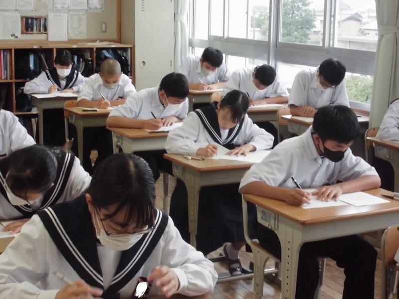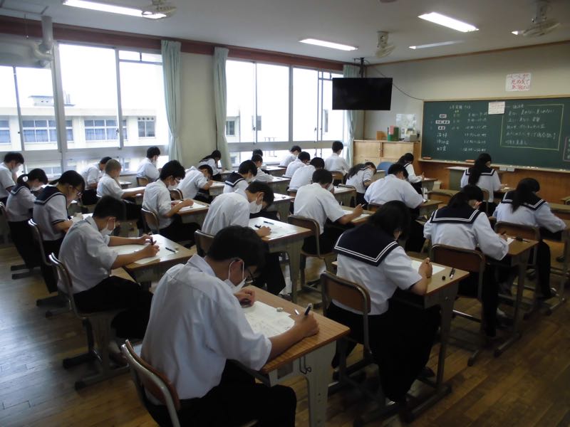 2年生の定期テスト一日目の様子です。時間いっぱいまで考え、あきらめずに問題を解こうとする姿がありました。明日のテストも実力を出し切って、頑張りましょう。