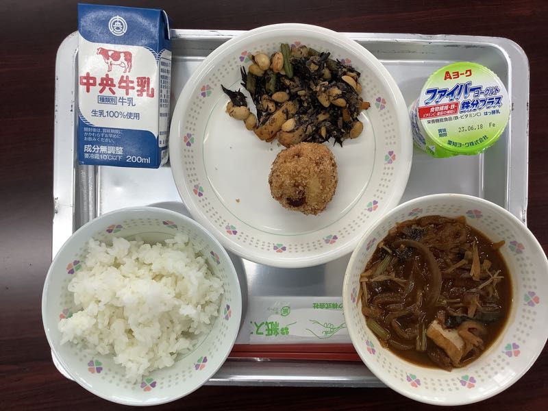 献立ご飯、牛乳、カレーコロッケ、ひじきの炒め煮、生揚げと小松菜のみそ汁カレーコロッケにはおからを使っており、成長期に必要なたんぱく質をたくさん取れるよう工夫しました。2時間目ごろには調理室からカレーのいい香りが漂ってきており、生徒たちが「お腹すいたー!」とつぶやいていました。