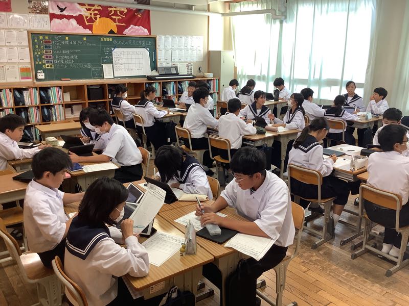 今日の6限は、総合的な学習の時間で、「働くこと」についての発表を行いました。生徒は今日まで、自分が興味をもった職業について調べたり、家族などから仕事について聞いたことをまとめたりしてきました。改めて自分なりに働く意義を考え、スライドを使ってグループで発表することができました。金曜にはクラス全体の前で発表を行う予定です。