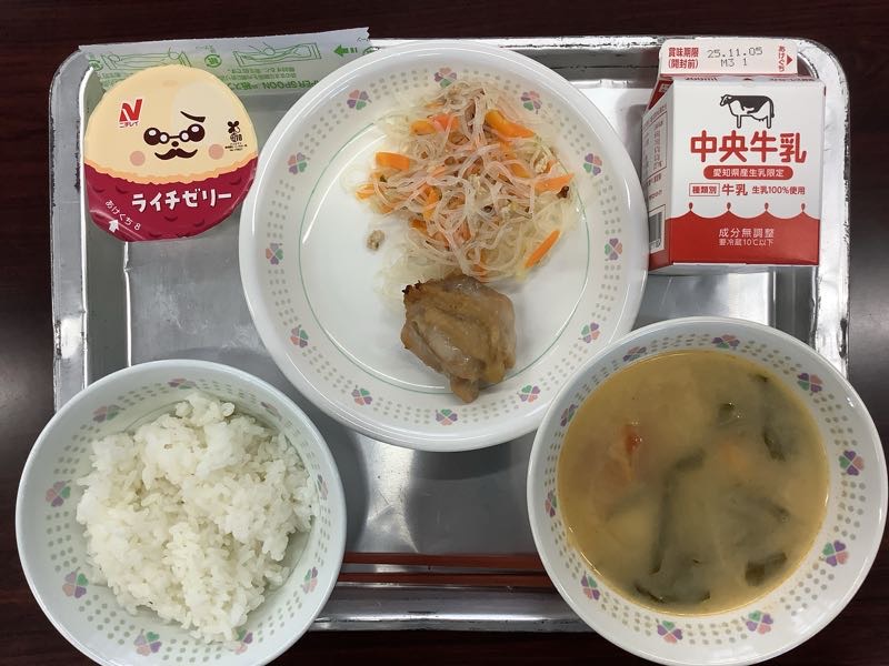 献立ご飯、牛乳、ガイヤーン(タイの鶏肉の照り焼き)、ヤム・ウンセン(タイのアーモンド入り春雨サラダ)、トムヤムクン風スープ(タイの辛くて酸っぱいえび入りスープ)、ライチゼリー来年9月に愛知県で開催される「アジア競技大会」のフレンドシップ事業として、タイ料理が給食に登場しました。給食用に、本場の味よりもやさしくしての提供です。はじめて出会う味にびっくりする生徒、おかわりする生徒といろんな表情がありました。国際理解につながるきっかけとなるとよいですね。