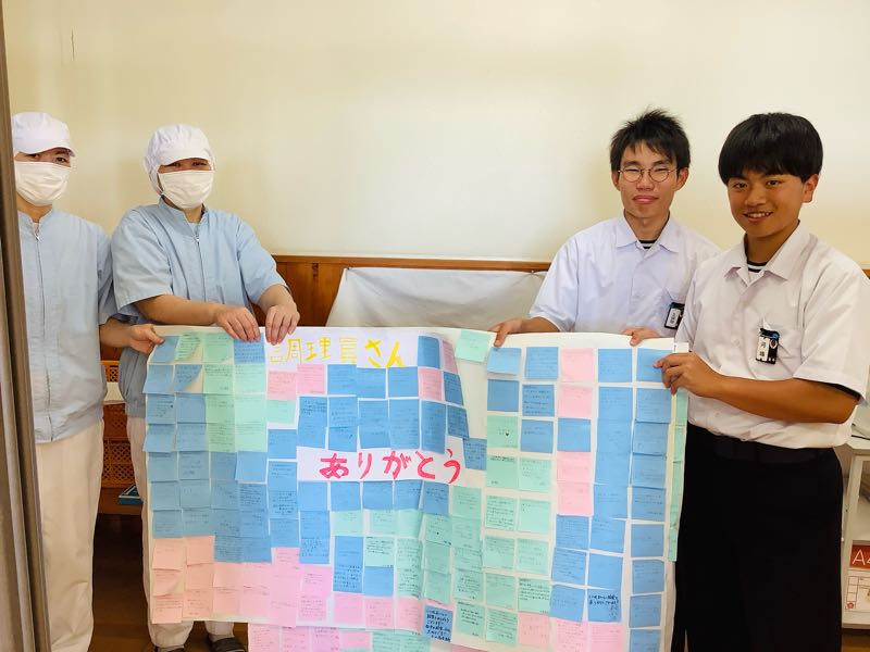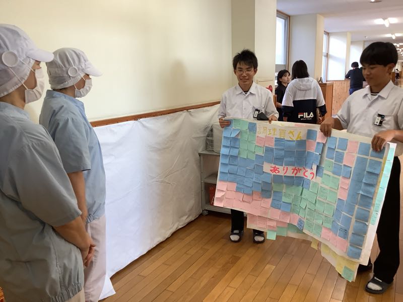 給食専門委員会の呼びかけで、全校生徒から調理員さんへ、リクエスト給食のお礼と日ごろの感謝の気持ちを込めたメッセージを書きました。感謝の言葉と共に、前期・後期給食専門委員長から調理員さんへと手渡されました。
