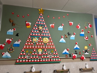 図書室前の掲示が変わりました。12月が近づいてきた今回は、たくさんのサンタクロースでクリスマスツリーを表現した賑やかな掲示になりました。クリスマスがわくわくするような素敵な掲示です。いつもありがとうございます!