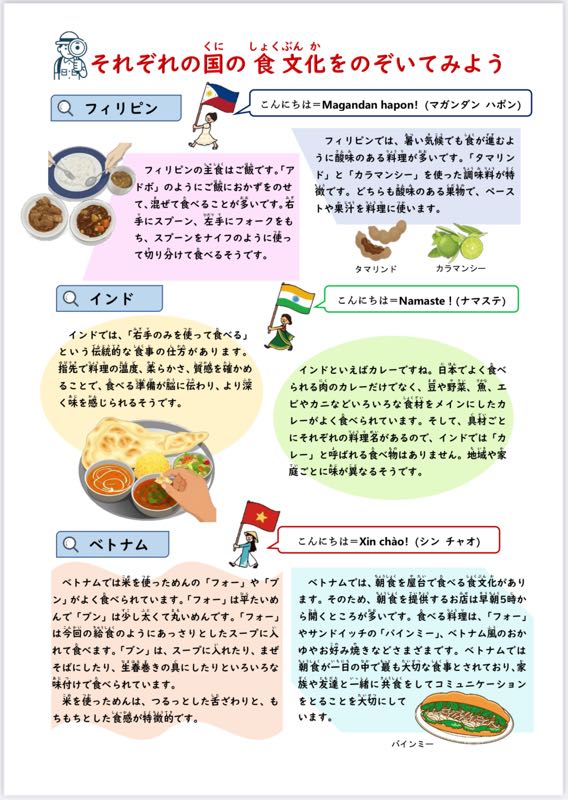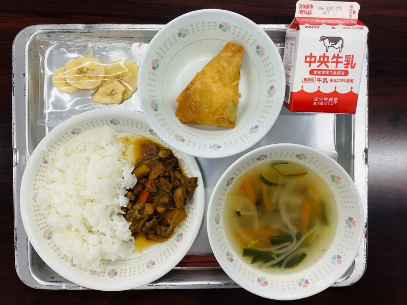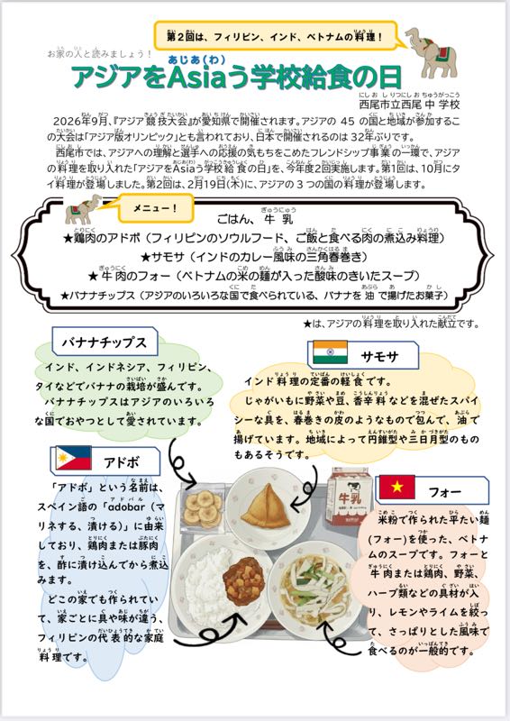 献立ご飯、牛乳、鶏肉のアドボ(フィリピン)、サモサ(インド)、牛肉のフォー(ベトナム)、バナナチップス今年9月に愛知県で開催される『アジア競技大会』のフレンドシップ事業の一環で、アジアへの理解と選手への応援の気持ちをこめて、給食で3つの国のアジア料理を提供しました。まるで、食べながらアジア旅行しているような給食でした。フィリピンにルーツがある生徒が「お母さんのアドボに似てる!」と笑顔で食べていました。