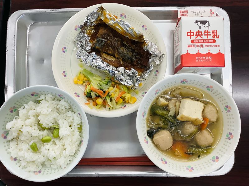 献立枝豆としらすの混ぜご飯、牛乳、さばの銀紙焼き、ブロッコリーのサラダ、鶏団子汁今日は2-1眞木志朋さんの献立です。しらす干しもさばの銀紙焼きも、中学生に重要な栄養素であるカルシウムが豊富です。旬のブロッコリーやキャベツを使ったサラダはビタミンCたっぷり。献立を考えている時、彩りも意識したとのことで、五感で春を楽しめる給食がとても好評でした。
