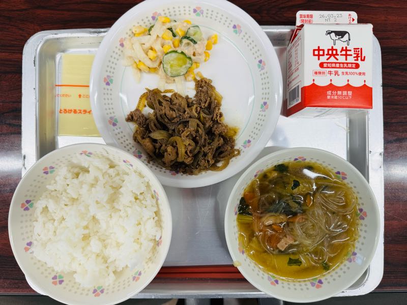 ご飯、牛乳、牛丼の具、ツナコーンサラダ、あさりと春キャベツのスープ、スライスチーズ