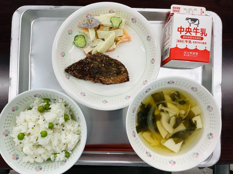 献立春の豆ご飯、牛乳、鰆の竜田揚げ、和風ポテトサラダ、若竹汁今日は、2-5石川直快さんの献立です。テーマは「春を感じる日本食 〜春の恵みをいただきます〜」。四季を大切にする日本食の心を表した献立です。えんどう豆、さわら、わかめ、たけのこなど、旬の食材がふんだんに使われて、テーマの通り、やわらかな春を感じる素敵な給食でした。