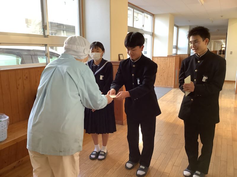 3年生の代表の生徒が、調理員さんへ3年間の感謝の言葉と手紙を渡しました。「給食のおかげで毎日学校に来るのが楽しみでした。」「午後の授業ががんばれたのは給食のおかげです。」心からの感謝、しっかりと伝わったと思います。