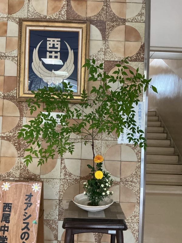 今日の花材は、南天、ポンポンマム(菊)、スプレーカーネーションです。南天の花言葉は「ナンテンから難を転じる」です。新学期が始まりいろいろな苦難があるかと思いますが、難を転じて福がくるように、がんばってくださいね。