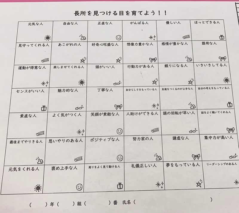 各項目に当てはまるクラスの仲間の名前を書き、切り取った紙を本人に渡します。