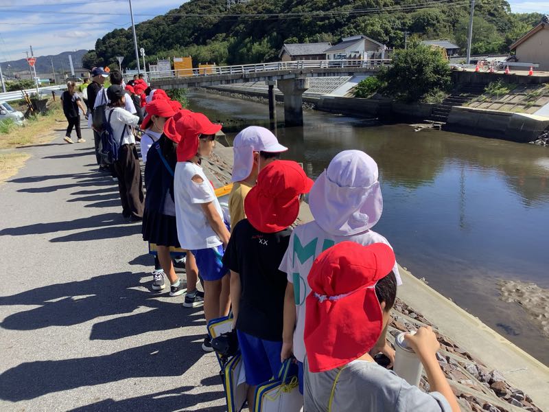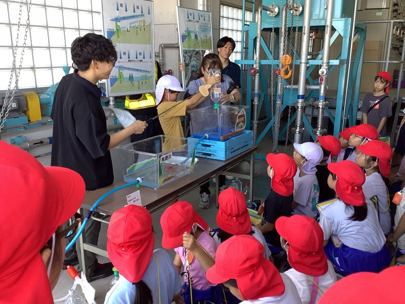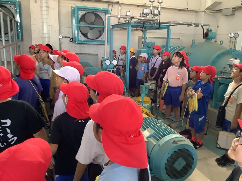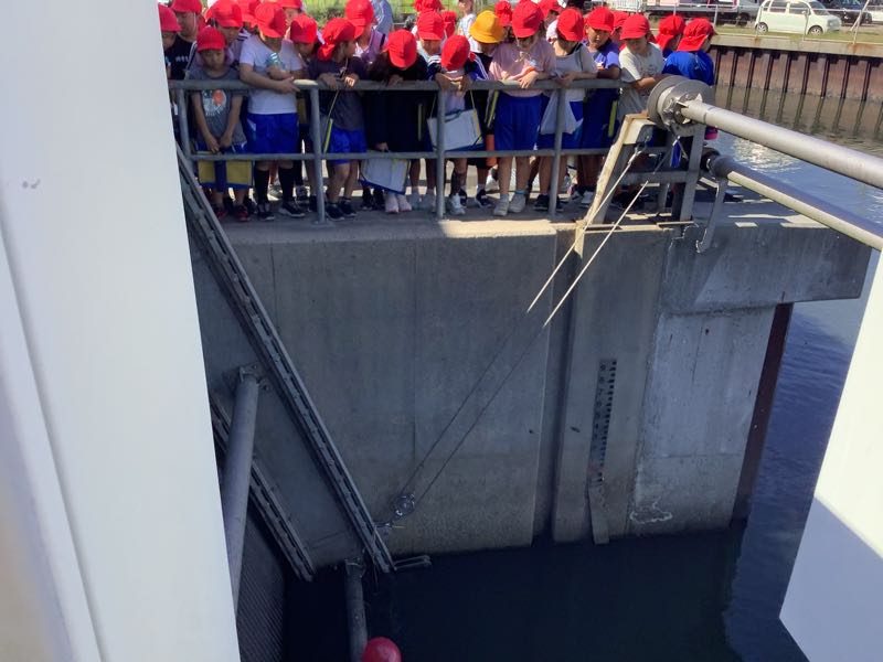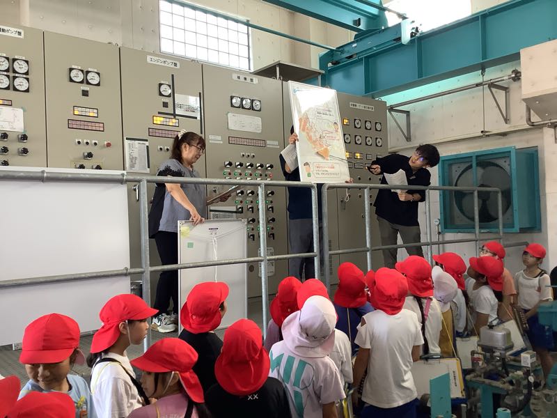 排水機場の見学では、職員の方に実際に実験をしたり、イラストを使ったりして分かりやすく説明していただきました。大雨が降っても西尾市が水浸しにならないのは、排水機場があるからということを実際に目で見て学ぶことができました。これからの社会の防災の授業につなげていきます。