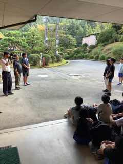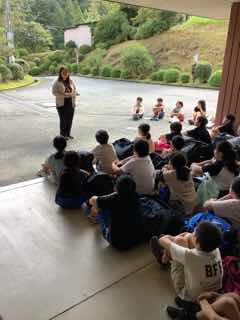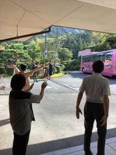 退所式をしました。お世話になった施設の方々、カウンセラーさん、写真師さんにお礼を伝えました。予定通りの時間にやまびこの丘を出発し、荻原小学校への帰路につきました。