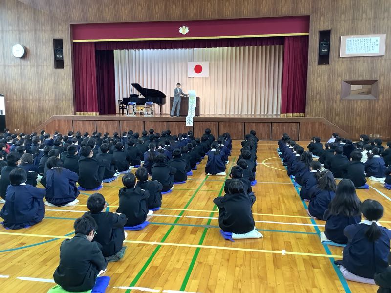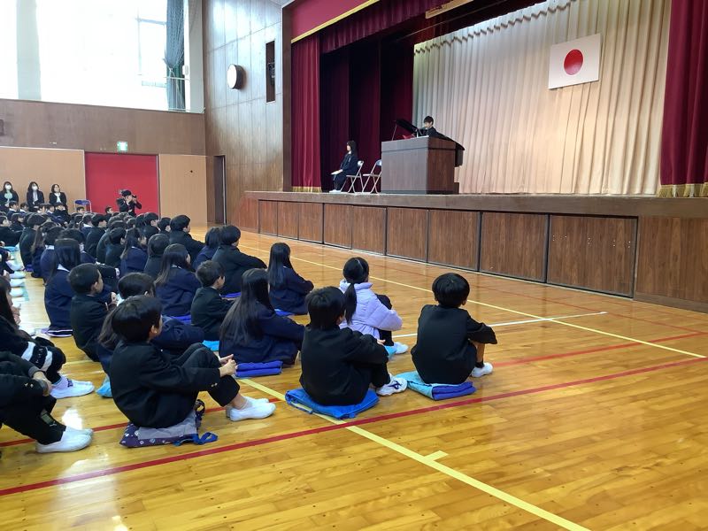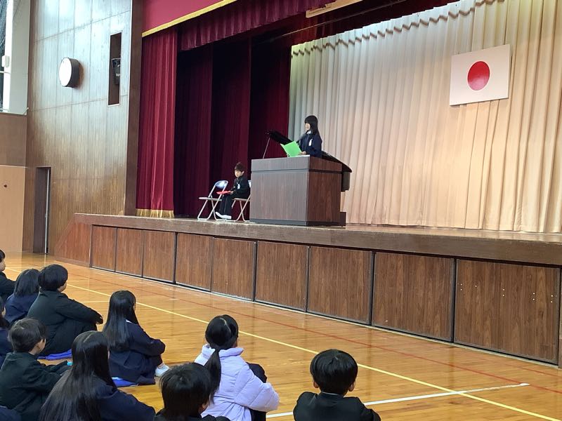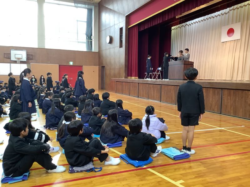 式では、代表児童による「2学期の振り返り」、校長先生のお話、校歌斉唱がありました。