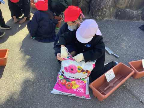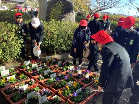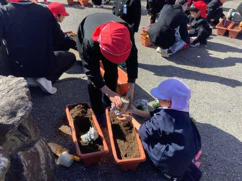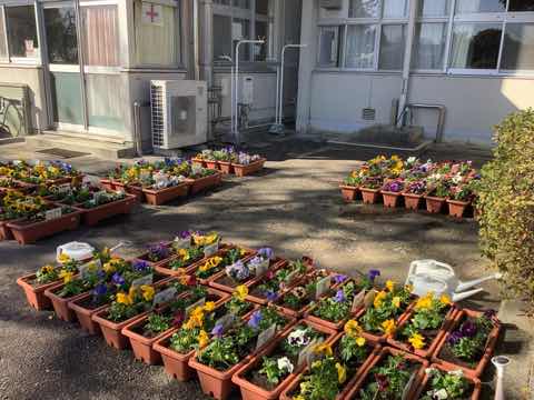 卒業式に体育館を飾るお花を1年生と6年生でプランターに植えました。今日から卒業式当日まで、毎日ペアで協力して水やりを頑張ります。