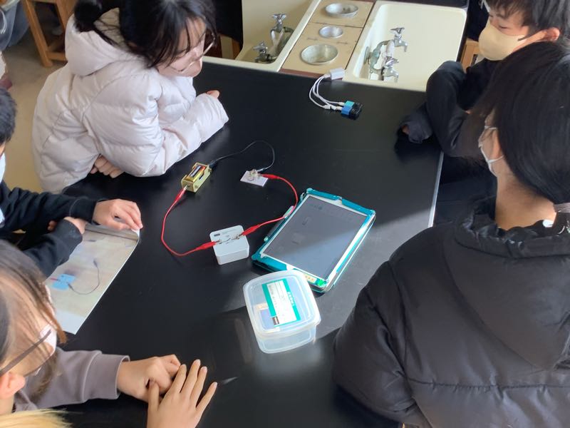 6年生は理科の時間に、人感センサーや明るさセンサーを使って、明かりをつけるプログラムを作成する授業を行いました。