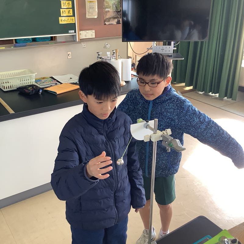 5年生は理科の時間に振り子の実験を行いました。振り子のひもの長さを変えて、振れる周期がどう変わるか調べました。