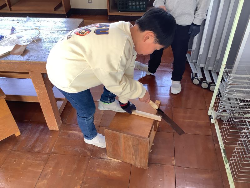 4年生は図工の時間に、ノコギリの使い方を学習しました。木材を切ってつないだ生き物作りで、初めてのノコギリを使って木を切るのに苦労している様子でした。