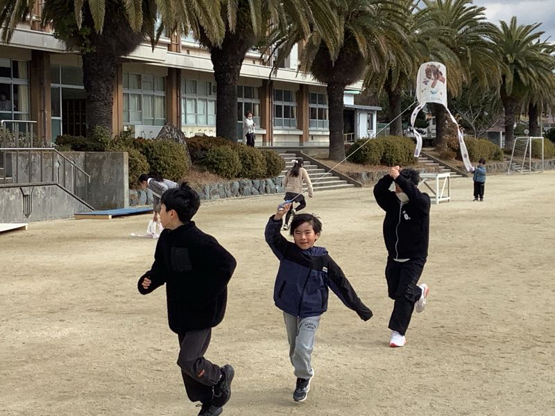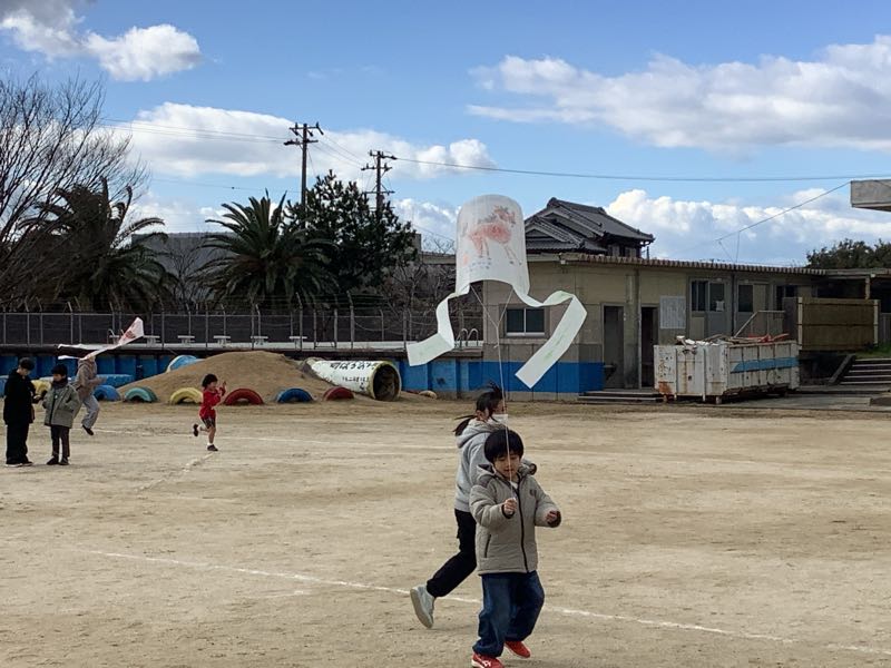 1年生が図工の授業で作成した凧を上げました。6年生のサポートを受けて、凧同士や木に絡まることなく上手に上げることができました。