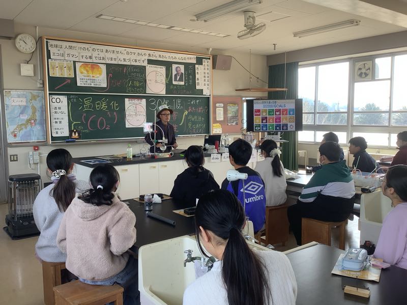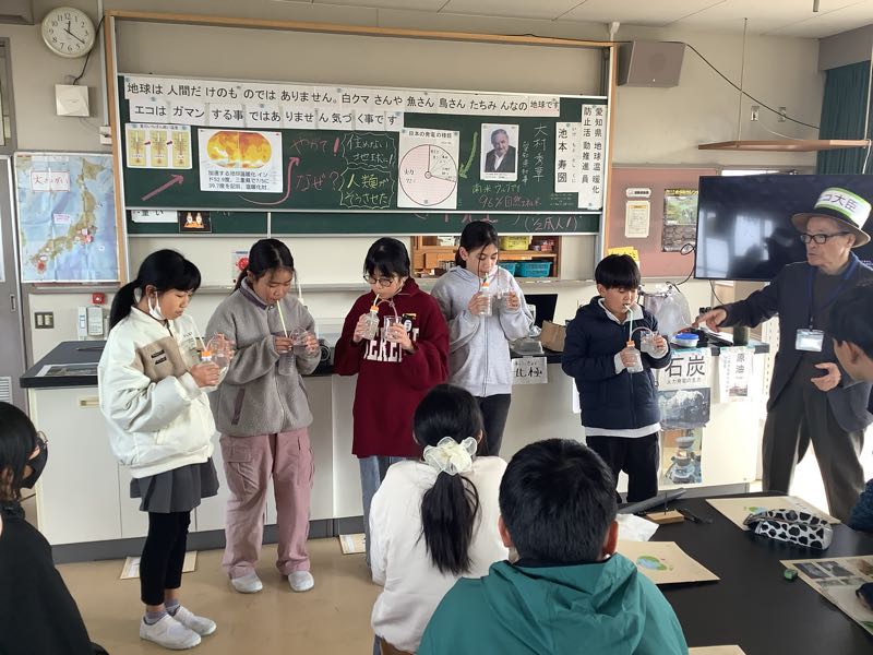 5年生が、ストップ温暖化教室を行いました。講師の先生のお話や実験を通して、二酸化炭素を出さないようにしようとの思いをもちました。