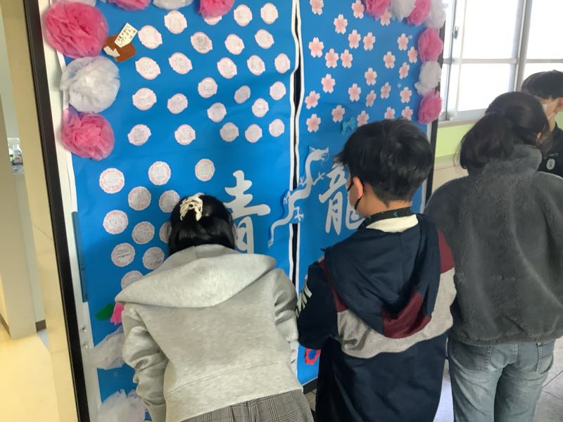 在校生や先生から6年生へのメッセージが貼られた掲示物が昇降口前に設置されました。投稿してきた6年生へは一人一人からのメッセージを真剣に読んでいました。